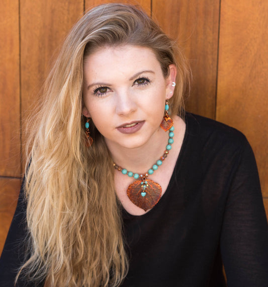 Gold leaf lariat, Turquoise & white Freshwater pearls